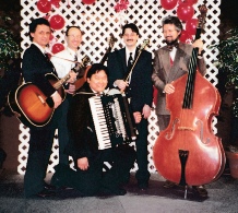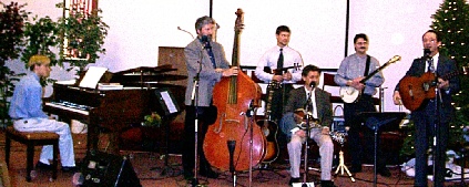 Right: Here are the original five: Clint Dickerson (guitar and vocals), Tim Greenlaw (guitar and vocals), Dan Darrikhuma (accordion), Steve Wagner (banjo), and Steve Dickerson (bass and vocals). An accordion seems like a strange instrument for a bluegrass band, but it worked pretty well!